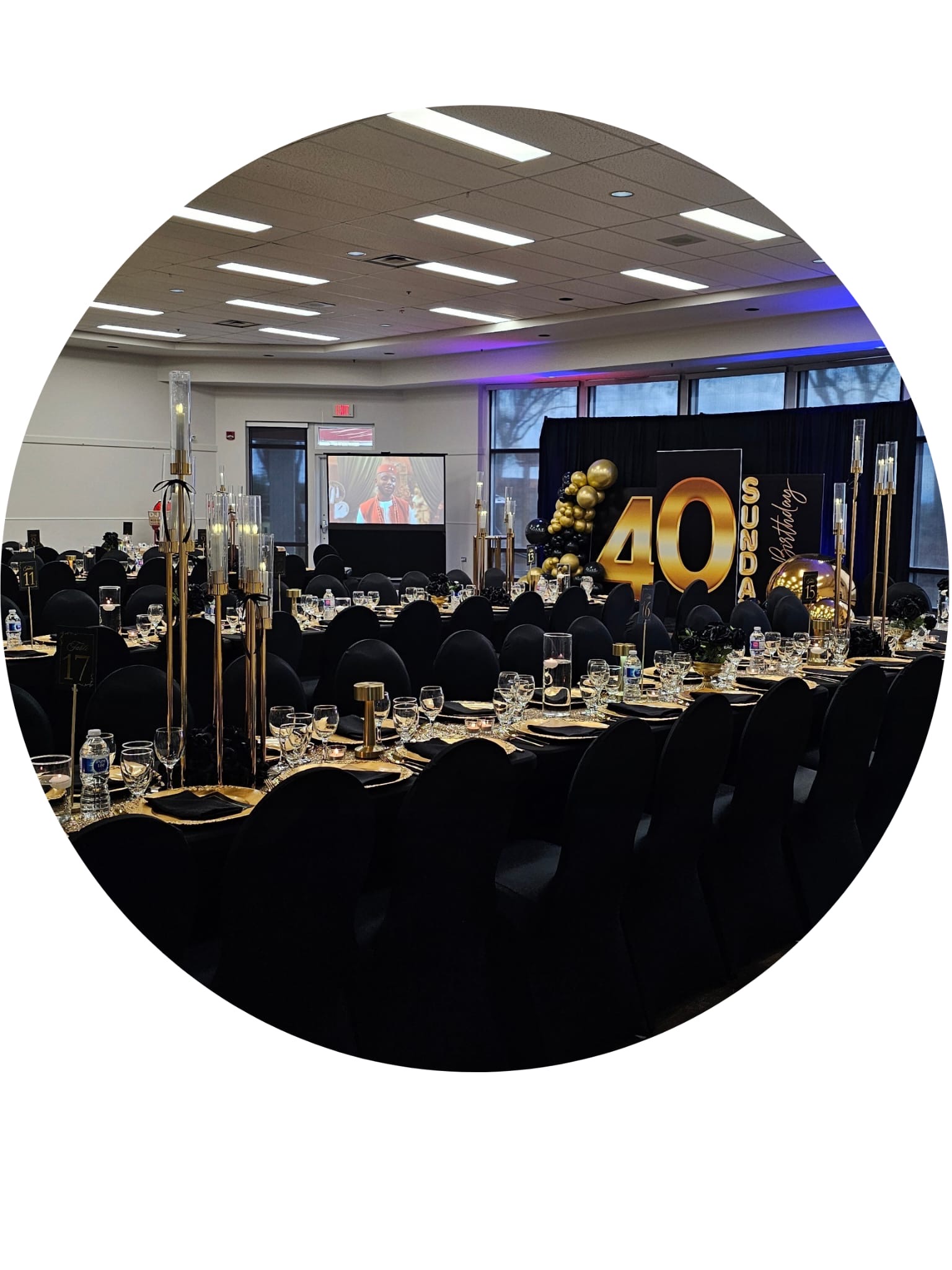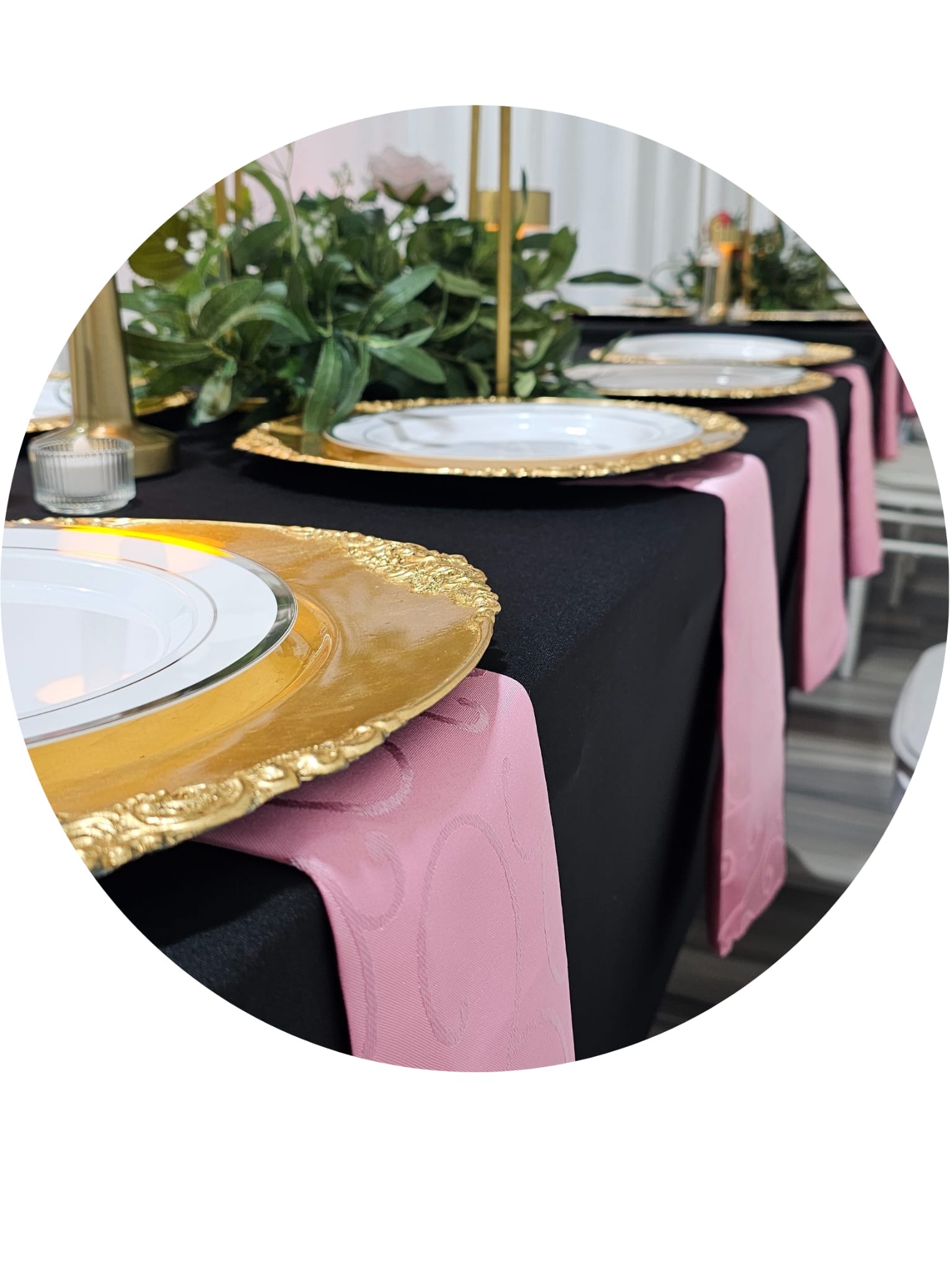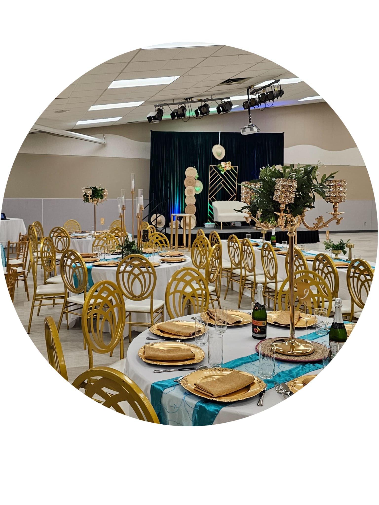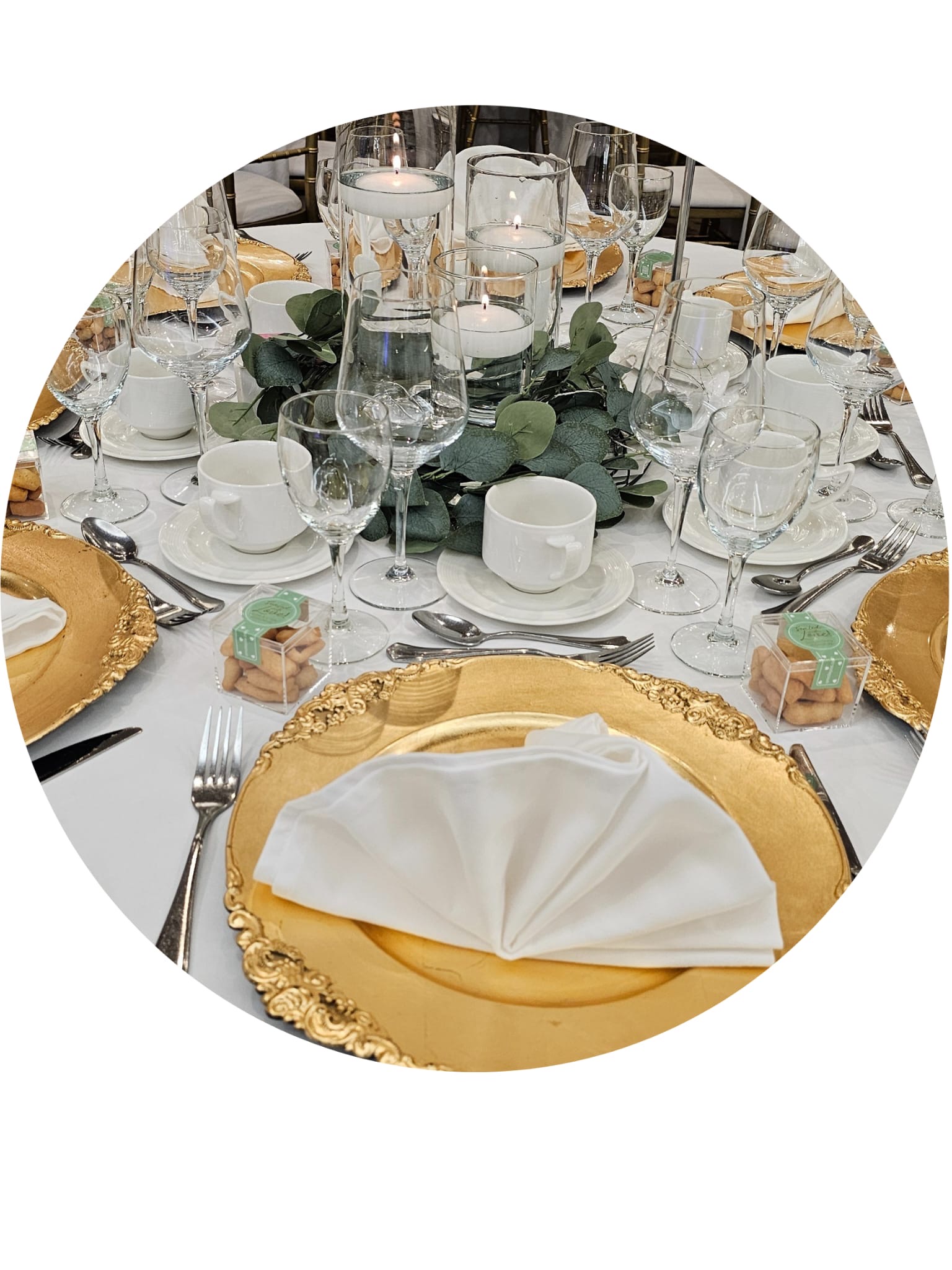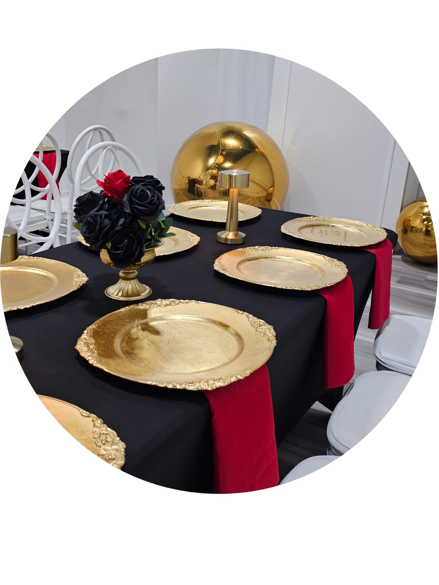 Decorations to include food table setup, charger plates, table napkins, wine glasses, cutleries, table cloths, center pieces, backdrop specific to event