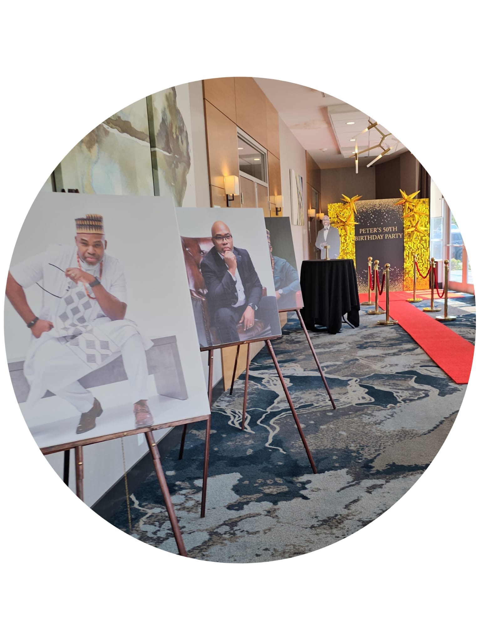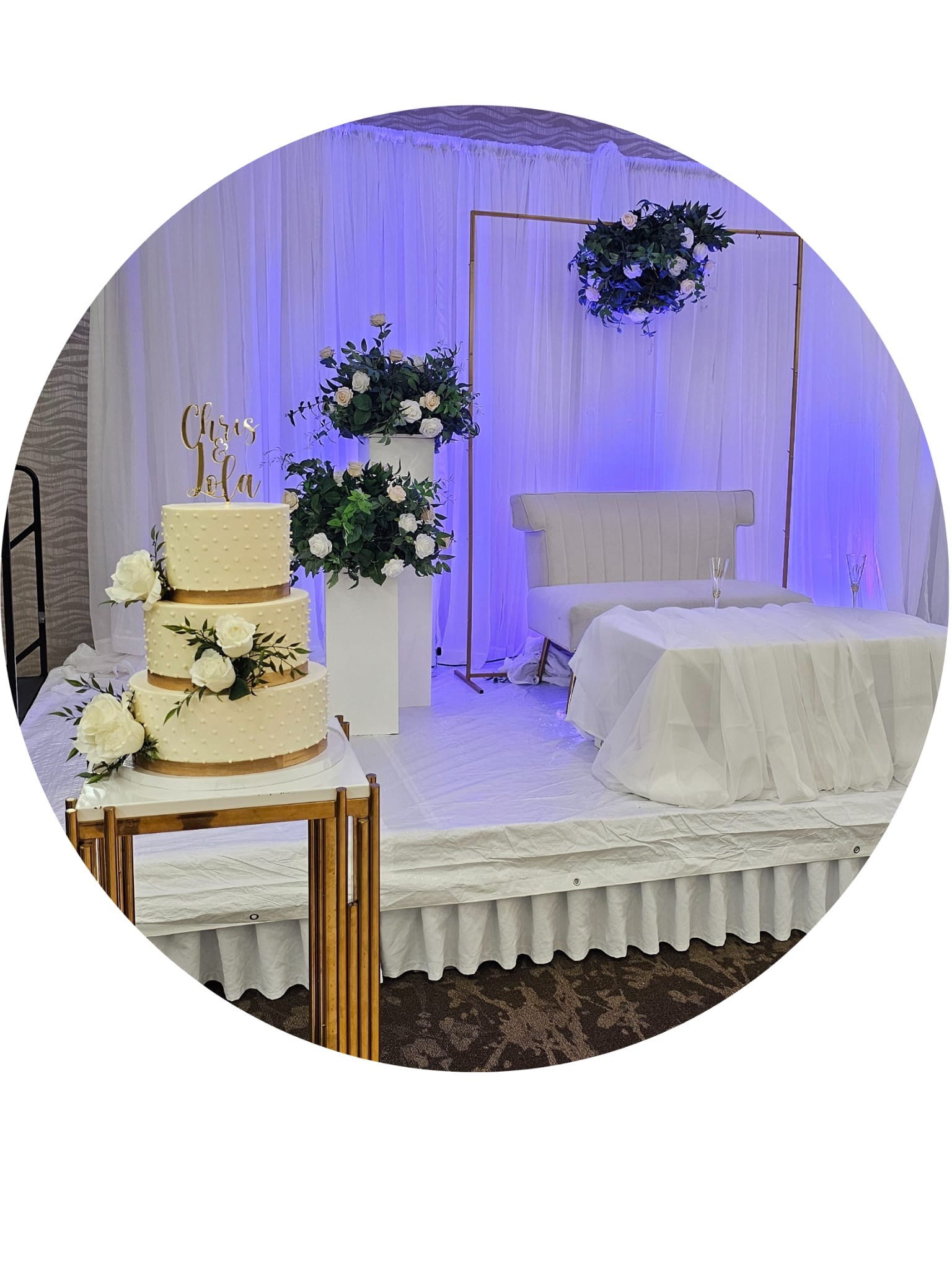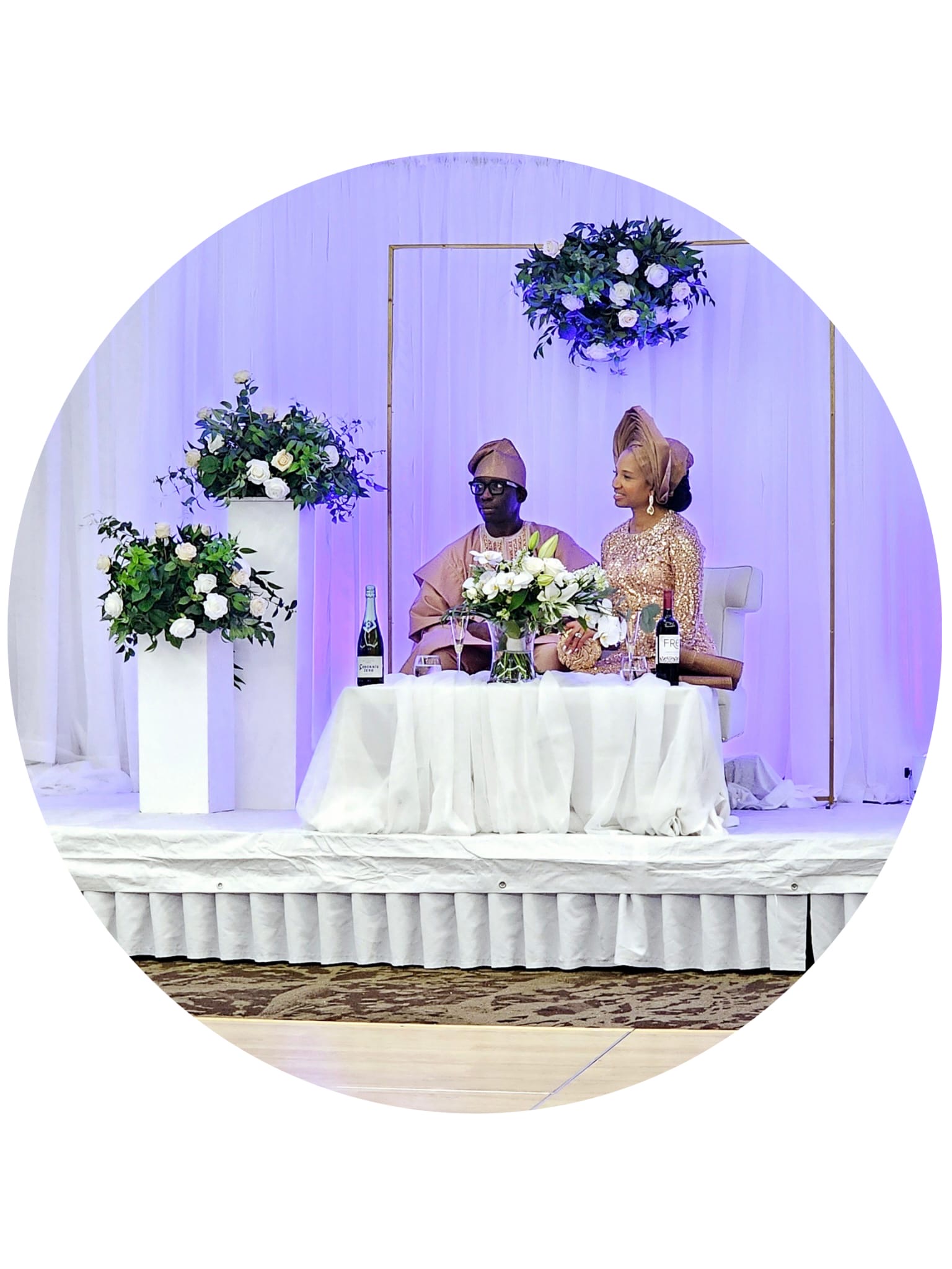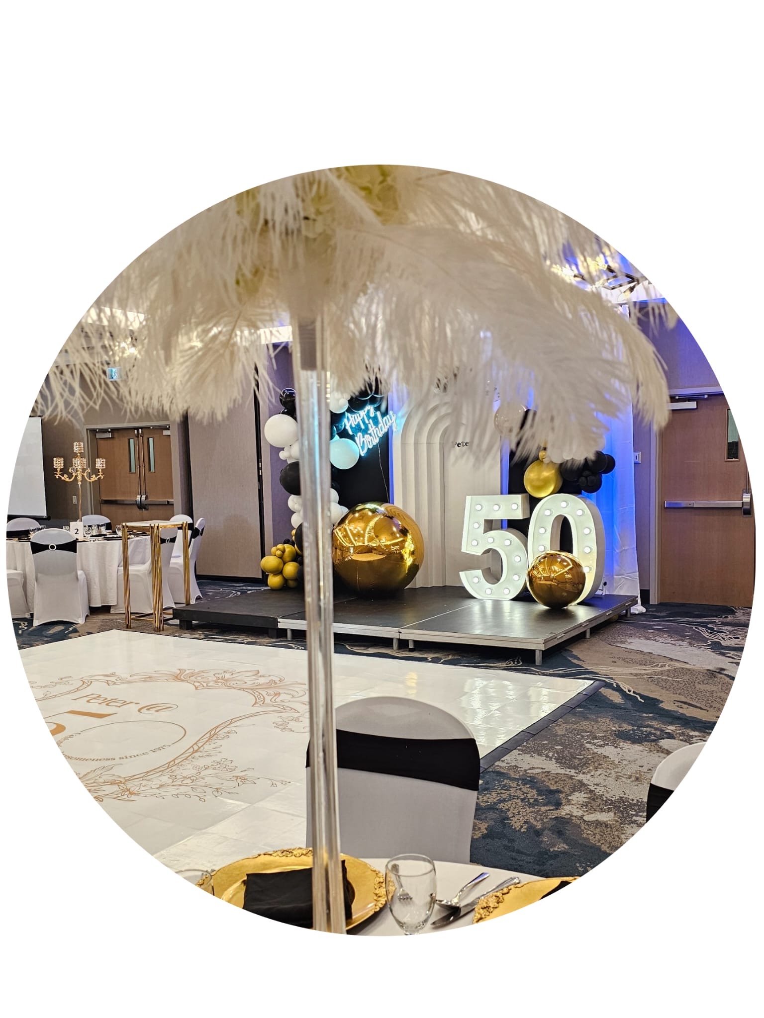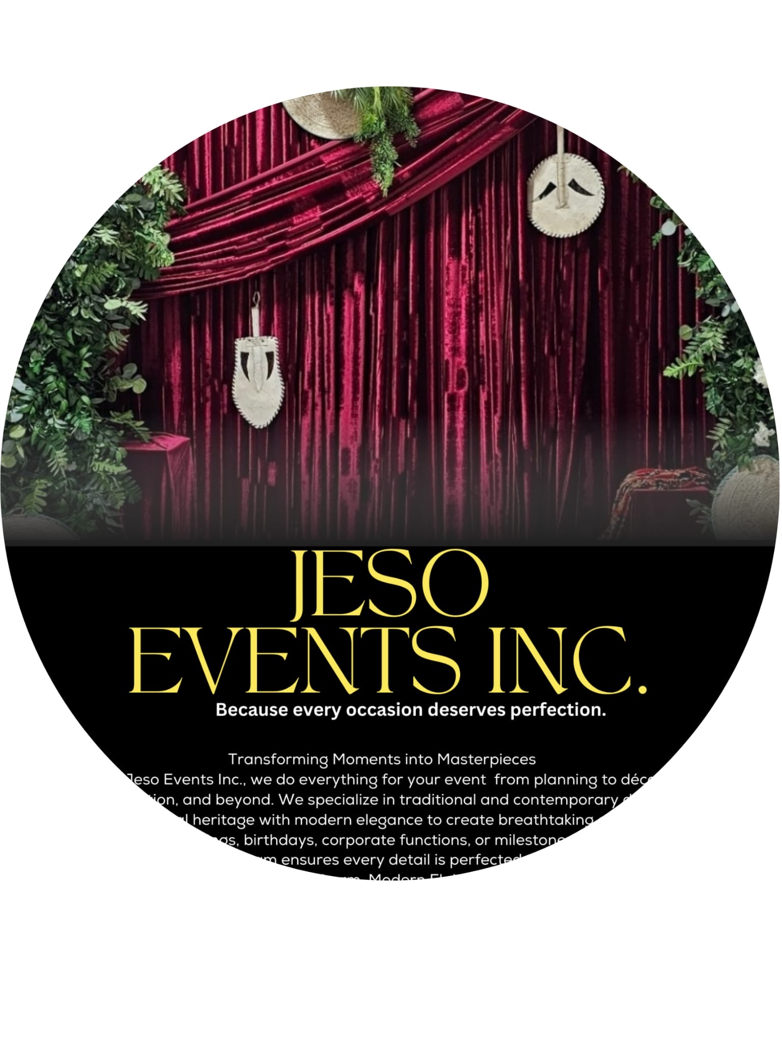 Decorations to include food table setup, charger plates, table napkins, wine glasses, cutleries, table cloths, center pieces, backdrop specific to event