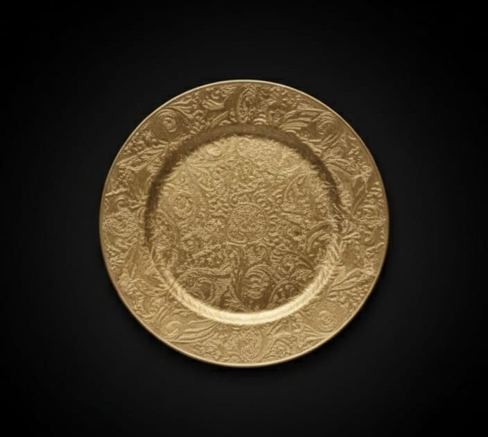 Elegant gold charger plates designed to enhance table settings. Perfect for weddings, parties, and formal events. Adds a refined touch to dining presentations and complements luxury décor themes.